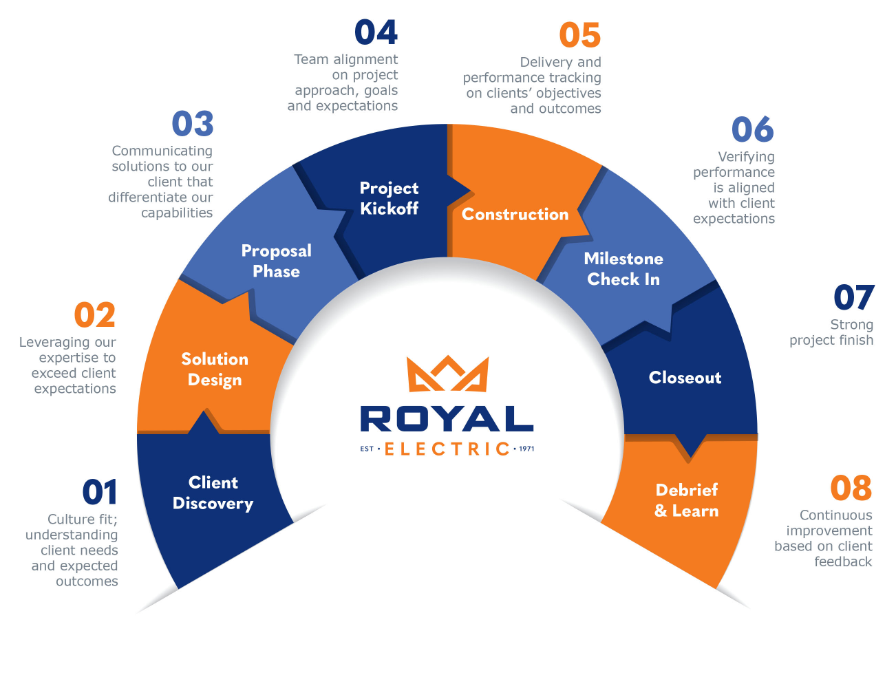 Royal’s comprehensive project bid and execution process provides peace of mind for our clients when projects are mission critical. We’ll proactively work with you to determine the specific outcomes you want to achieve, addressing as many concerns and expectations as possible before work begins. Additionally, we’ll review the construction plans with you to ensure your team is aware of industry regulations that could impact your project -helping you minimizes delays and fines, as well as avoid electrical constructability issues and scope changes.